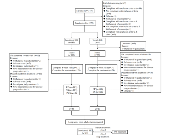 治疗为期8周,每日早晚外用泽立美®本维莫德乳膏或安慰剂(安慰剂为本维莫德乳膏的润肤基质,不含活性成分);结束后可进入44周开放标签扩展期,持续使用泽立美®本维莫德乳膏直至IGA评分降至0。双盲阶段允许使用温和保湿剂,扩展期可短期使用局部钙调磷酸酶抑制剂作为挽救治疗(图1)。主要终点为第8周EASI改善≥75%的患者比例,关键次要终点为达到IGA 0/1且较基线下降≥2分的患者比例,其他次要终点包括EASI 90、BSA变化及瘙痒评分(PP-NRS)降低≥3分的比例。