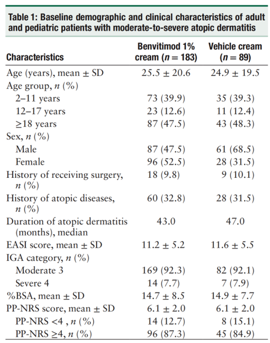 本研究共纳入272例中重度AD患者,其中183例接受泽立美®本维莫德乳膏治疗,89例接受安慰剂对照。两组在基线人口学特征和基线疾病特征平衡(表1),且泽立美®本维莫德乳膏组的脱落率显著低于对照组(7.1% vs. 15.9%),提示其良好的依从性和耐受性。