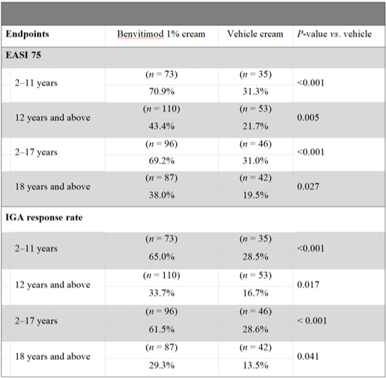 治疗第8周时,泽立美®本维莫德乳膏组EASI 75应答率显著高于对照组(54.4% vs 25.5%,Δ28.9%,P<0.001)(图2),这一优势早在第1周即显现(数值差异12.3%),至第4周达统计学意义(37.9% vs 19.7%,P=0.007)。更值得注意的是,儿童亚组(2-17岁)疗效更为突出,EASI 75应答率达69.2%(vs 31.0%,Δ38.2%)(表2)。说明泽立美®本维莫德乳膏对不同年龄段人群均具有强效作用。