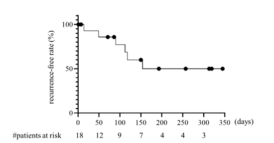 在开放标签扩展阶段,43名来自原始研究队列的患者继续接受本维莫德乳膏治疗,其中27例(62.7%)的患者至少一次达到并维持IGA =0/1状态超过16周,表明该药物不仅具有显著短期疗效,还能在较长时间内维持临床改善。Kaplan-Meier分析显示,在18例达到IGA 0的开放标签应答者中,无复发率在约200天时逐渐下降至约50%,随后在一年随访期内趋于平稳(图5)。整个开放标签阶段仅报告一例3级治疗期间出现的不良事件(代谢综合征),未发现其他3-5级严重不良事件。